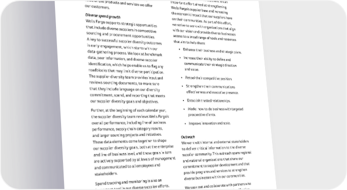 69 The following strategic approaches help us develop strong relationships with our suppliers to achieve our supplier diversity goals, while also striving to enhance the value of the products and services we offer our customers . Diverse spend growth Wells Fargo supports strategic opportunities that include diverse suppliers in competitive sourcing and procurement opportunities . A key to successful supplier diversity outcomes is early engagement, which starts with our data-gathering process . We look at benchmark data, peer information, and diverse supplier identification, which helps enable us to flag any roadblocks that may limit diverse participation . The supplier diversity team provides input and reviews sourcing documents, to make sure that they include language on our diversity commitment, spend, and reporting that meets our supplier diversity goals and objectives . Further, at the beginning of each calendar year, the supplier diversity team reviews Wells Fargo’s overall performance, including line of business performance, supply chain category results, and larger sourcing projects and initiatives . These data elements come together to shape our supplier diversity goals, both at the enterprise and line of business level, and these goals in turn are actively supported by all levels of management and communicated to all employees and stakeholders . Spend tracking and monitoring is also an important tool in our diverse supplier efforts . We track and report on our performance on a quarterly basis and these reports include detailed information about our procurement spending . Supplier development We invest in building capacity and expertise for high-potential diverse suppliers . It’s an important effort aimed at strengthening Wells Fargo’s supplier base and increasing the economic impact that our suppliers have on their communities . As part of this effort, we strive to work with organizations that align with our vision and provide diverse businesses access to a broad range of tools and resources that aim to help them: • Enhance their business and strategic plans . • Incr ease their ability to define and communicate their strategic direction and value . • Retool their competitive position . • Strengthen their communications effectiveness and executive presence . • Establish trusted relationships . • Model how to do business with targeted prospective clients . • Improve innovation and scale . Outreach We work with internal and external stakeholders to deliver critical information to the diverse supplier community . This outreach spans regional and national organizations that share our commitment to supplier development and that provide programs and services to strengthen diverse businesses within our communities . We seek out and collaborate with partners who align with us on diverse supplier identification, certification, development, and engagement .