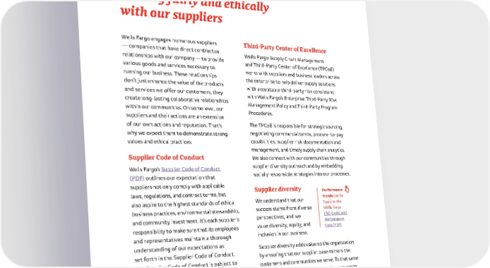 68 Third-Party Center of Excellence Wells Fargo Supply Chain Management and Third-Party Center of Excellence (TPCoE) works with suppliers and business leaders across the enterprise to help deliver supply solutions with acceptable third-party risk consistent with Wells Fargo’s Enterprise Third-Party Risk Management Policy and Third-Party Program Procedures . The TPCoE is responsible for strategic sourcing, negotiating commercial terms, procure-to-pay capabilities, supplier risk documentation and management, and timely supply chain analytics . We also connect with our communities through supplier diversity outreach and by embedding socially responsible strategies into our processes . Supplier diversity We understand that our success stems from diverse perspectives, and we value diversity, equity, and inclusion in our business . Supplier diversity adds value to the organization by ensuring that our supplier base mirrors the customers and communities we serve . To that same end, our Supply Chain Management group works closely with all our lines of business, as well as internal and external stakeholders, to help grow relationships with certified minority, women, LGBTQ, veteran, disability-owned, and small businesses . Wells Fargo engages numerous suppliers — companies that have direct contractual relationships with our company — to provide various goods and services necessary to running our business . These relationships don’t just enhance the value of the products and services we offer our customers, they create long-lasting collaborative relationships within our communities . On some level, our suppliers and their actions are an extension of our own actions and reputation . That’s why we expect them to demonstrate strong values and ethical practices . Supplier Code of Conduct Wells Fargo’s Supplier Code of Conduct (PDF) outlines our expectation that suppliers not only comply with applicable laws, regulations, and contract terms, but also aspire to the highest standards of ethical business practices, environmental stewardship, and community investment . It’s each supplier’s responsibility to make sure that its employees and representatives maintain a thorough understanding of our expectations as set forth in the Supplier Code of Conduct . The Supplier Code of Conduct is subject to regular review and periodic revisions as we continuously work to enhance our business practices . Dealing fairly and ethically with our suppliers Performance trends can be found in the Wells Fargo ESG Goals and Performance Data (PDF) .