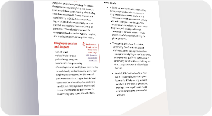 74 Global philanthropy Our global philanthropy strategy focuses on disaster response, local giving, and strategic grants made to support housing affordability, small business growth, financial health, and sustainability . In 2020, funds supported organizations that are specifically focused on relief and recovery from the COVID-19 pandemic . These funds were used for emergency food as well as hygiene, hospital, and medical supplies, among other needs . Employee service and impact Part of what makes Wells Fargo’s philanthropy program so robust is the generosity of employees who multiply our community impact, locally and collectively . Every year, eligible employees receive 16 hours of paid volunteer time to give back to local communities where they live and work . In addition, employees are encouraged to use their talents to get involved in causes they care about and volunteer . These include: • In 2020, we held our first Month of Action, during which we charted a new course in employee engagement to inspire acts of kindness and virtual volunteerism globally and to kick off year-round giving . This new approach helped care for communities, neighbors, and colleagues through thousands of personal actions — which proved especially meaningful during the global pandemic . • Through the Wells Fargo Foundation, Community Care Grants help extend the impact of our employees’ donations . Through personal giving or service activities, employees may qualify for up to $2,000 in Community Care Grant funds that they can direct to approximately 1 million eligible charities . • Nearly 5,500 charities benefited from Wells Fargo employees sharing their leadership skills by serving as board members of charitable organizations, making a meaningful impact in the external communities where we live and work . Performance trends can be found in the Wells Fargo ESG Goals and Performance Data (PDF) .