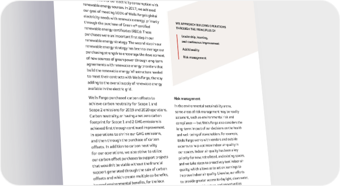89 An example of how supporting additionality is reflected in our building operations is our effort to meet 100% of our electricity consumption with renewable energy sources . In 2017, we achieved our goal of meeting 100% of Wells Fargo’s global electricity needs with renewable energy, ¹ primarily through the purchase of Green-e® certified renewable energy certificates (RECs) . These purchases were an important first step in our renewable energy strategy . The second step in our renewable energy strategy has been to leverage our purchasing strength to encourage the development of new sources of green power through long-term agreements with renewable energy providers that build the renewable energy infrastructure needed to meet their contracts with Wells Fargo, thereby adding to the overall supply of renewable energy available in the electric grid . Wells Fargo purchased carbon offsets to achieve carbon neutrality for Scope 1 and Scope 2 emissions for 2019 and 2020 operations . Carbon neutrality, or having a net zero carbon footprint for Scope 1 and 2 GHG emissions is achieved first through continued improvement in operations to shrink our GHG emissions, and then through the purchase of carbon offsets . In addition to carbon neutrality for our operations, we also strive to utilize our carbon offset purchases to support projects that wouldn’t be viable without the financial support generated through the sale of carbon offsets and which create multiple co-benefits, beyond environmental benefits, for the local community . Risk management In the environmental sustainability arena, some areas of risk management may be readily apparent, such as environmental risk and compliance — but Wells Fargo also considers the long-term impact of our decisions on the health and well-being of stakeholders . For example, Wells Fargo works with vendors and outside experts to help optimize indoor air quality in our spaces . Indoor air quality has been a key priority for new, retrofitted, and existing spaces, and we take steps to proactively test indoor air quality, which allows us to act on learnings to improve indoor air quality . Likewise, our efforts to provide greater access to daylight, clean water, a connection with nature, and opportunities for greater physical activity play a role in safeguarding the mental and physical health of our customers and employees . WE APPROACH BUILDING OPERATIONS THROUGH THE PRINCIPLES OF Leadership, learning, and continuous improvement Additionality Risk management 1 . Renewable energy sources include on-site solar, long-term contracts that support net new sources of off-site renewable energy, and the purchase of renewable energy certificates .