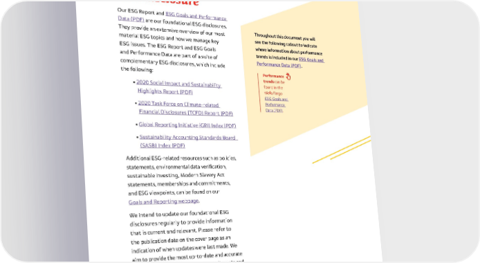 7 Our ESG Report and ESG Goals and Performance Data (PDF) are our foundational ESG disclosures . They provide an extensive overview of our most material ESG topics and how we manage key ESG issues . The ESG Report and ESG Goals and Performance Data are part of a suite of complementary ESG disclosures, which include the following: • 2020 Social Impact and Sustainability Highlights Report (PDF) • 2020 Task Force on Climate-related Financial Disclosures (TCFD) Report (PDF) • Global Reporting Initiative (GRI) Index (PDF) • Sustainability Accounting Standards Board (SASB) Index (PDF) Additional ESG-related resources such as policies, statements, environmental data verification, sustainable investing, Modern Slavery Act statements, memberships and commitments, and ESG viewpoints, can be found on our Goals and Reporting webpage . We intend to update our foundational ESG disclosures regularly to provide information that is current and relevant . Please refer to the publication date on the cover page as an indication of when updates were last made . We aim to provide the most up-to-date and accurate information in our disclosures . Commitments and time frames may vary . Providing enhanced ESG disclosure Performance trends can be found in the Wells Fargo ESG Goals and Performance Data (PDF) . Throughout this document you will see the following callout to indicate where information about performance trends is included in our ESG Goals and Performance Data (PDF) .