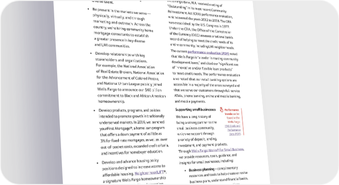 40 To help achieve these homeownership goals, we’ve developed a comprehensive five-pillar strategy: • Mirror the communities we serv e by recruiting, hiring, and retaining diverse talent . • Be present in the mark ets we serve — physically, virtually, and through marketing and outreach . Across the country, we’re hiring community home mortgage consultants to establish a greater presence in key diverse and LMI communities . • Dev elop relationships with key stakeholders and organizations . For example, the National Association of Real Estate Brokers, National Association for the Advancement of Colored People, and National Urban League publicly joined Wells Fargo to announce our $60 billion commitment to Black and African American homeownership . • Develop products, programs, and policies intended to promote growth in traditionally underserved markets . In 2016, we launched yourFirst Mor tgage®, a home loan program that offers a down payment of as little as 3% for fixed-rate mortgages, as well as lower out-of-pocket costs, expanded credit criteria, and incentives for homebuyer education . • Dev elop and advance housing policy positions designed to increase access to affordable housing . NeighborhoodLIFT ®, a signature Wells Fargo homeownership initiative we executed in collaboration with NeighborW orks® America and its network members, creates pathways to homeownership through homebuyer education and down payment assistance grants . We aim to achieve these goals while maintaining our focus on fair and responsible lending . Community Reinvestment Act Wells Fargo Bank, N .A . received a rating of “Outstanding” in its most recent Community Reinvestment Act (CRA) performance evaluation, which covered the years 2012 to 2018 . The CRA was established by the U .S . Congress in 1977 . Under the CRA, the Office of the Comptroller of the Currency (OCC) assesses a national bank’s record of helping to meet the credit needs of its entire community, including LMI neighborhoods . The current performance evaluation (PDF) noted that Wells Fargo is “a leader in making community development loans,” and cited our “significant use of innovative and/or flexible loan products” to meet credit needs . The performance evaluation also noted that our retail banking options are accessible in a majority of the areas surveyed and that we serve our customers through full-service ATMs, phone banking, online and mobile banking, and mobile payments . Supporting small businesses We have a long history of being a strong partner to the small business community, which we support through a variety of deposit, lending, investment, and payment products . Through Wells Fargo Works® for Small Business , we provide resources, tools, guidance, and insights for small businesses, including: • Business planning – complimentary resources and tools to help create or revise business plans, understand financial basics, and streamline company operations . • Marketing – essential marketing resources including market research, marketing tactics, sales methods, and tips to measure return on investment . Performance trends can be found in the Wells Fargo ESG Goals and Performance Data (PDF) .