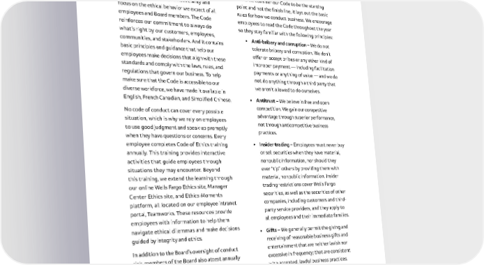 21 Code of Ethics and Business Conduct The Wells Fargo Code of Ethics and Business Conduct (PDF) (Code) provides clarity and focus on the ethical behavior we expect of all employees and Board members . The Code reinforces our commitment to always do what’s right by our customers, employees, communities, and stakeholders . And it contains basic principles and guidance that help our employees make decisions that align with these standards and comply with the laws, rules, and regulations that govern our business . To help make sure that the Code is accessible to our diverse workforce, we have made it available in English, French Canadian, and Simplified Chinese . No code of conduct can cover every possible situation, which is why we rely on employees to use good judgment and speak up promptly when they have questions or concerns . Every employee completes Code of Ethics training annually . This training provides interactive activities that guide employees through situations they may encounter . Beyond this training, we extend the learning through our online Wells Fargo Ethics site, Manager Center Ethics site, and Ethics Moments platform, all located on our employee intranet portal, Teamworks . These resources provide employees with information to help them navigate ethical dilemmas and make decisions guided by integrity and ethics . In addition to the Board’s oversight of conduct risk, members of the Board also attest annually that they have read and understand their obligations under the Code . While we consider our Code to be the starting point and not the finish line, it lays out the basic rules for how we conduct business . We encourage employees to read the Code throughout the year so they stay familiar with the following principles: • Anti-bribery and corruption – We do not tolerate bribery and corruption . We don’t offer or accept bribes or any other kind of improper payment — including facilitation payments or anything of value — and we do not do anything through a third party that we aren’t allowed to do ourselves . • Antitrust – We believe in free and open competition . We gain our competitive advantage through superior performance, not through anticompetitive business practices . • Insider trading – Employees must never buy or sell securities when they have material, nonpublic information, nor should they ever “tip” others by providing them with material, nonpublic information . Insider trading restrictions cover Wells Fargo securities, as well as the securities of other companies, including customers and third- party service providers, and they apply to all employees and their immediate families . • Gifts – We generally permit the giving and receiving of reasonable business gifts and entertainment that are neither lavish nor excessive in frequency; that are consistent with accepted, lawful business practices . • Conflict of interest – We work to avoid conflicts of interest in our employees’ personal and business activities in a number of circumstances, including through outside employment or business