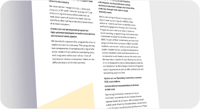 51 Launch a “returnship” program focused on diverse talent who have been out of the workforce for an extended period to support their return to the industry We launched our inaugural Glide — Relaunch program , a 10-week “returnship program” that aims to bring talented professionals with at least seven years of experience back into the workforce after taking a voluntary career break of at least two years . Create a formal development program for high-potential employees to build a more diverse and inclusive talent pipeline We launched a sponsorship program for diverse leaders across the company . This program has two components: A companywide program for senior leaders from underrepresented groups, and programs within each of our lines of business to mentor and sponsor talent across different levels within the business . Expand the reach of early talent program recruiting by increasing our participation with Hispanic-serving institutions (HSIs), and historically Black colleges and universities (HBCUs), through visits and in-house diversity events We’re continuing to focus on early talent recruitment by working with HBCUs, HSIs, and other national partners to identify talent and build engagement through our University Programs team . We’ve almost tripled our talent sourcing, programming, and sponsorship investment in 2021 from what we spent in 2020 . As part of that investment, we have built programs that directly support HBCU and HSI students, such as our recently launched Senior Leader Speaker Series, a program designed to support students’ continued development via conversations with leaders across the enterprise . We have also created a Virtual Mentorship Series, which is designed to keep undergraduate students connected to the Wells Fargo University Programs recruiting process as well as offer professional and networking opportunities . Update on our Operating Committee member DE&I expectations Increase diverse representation at all levels in their area Operating Committee members strive to fulfill their commitments to increase diverse representation at all levels . We’ve established a dedicated, diversity-focused talent review twice a year for each line of business and function . These reviews include detailed assessments of the strengths and development areas, career plans, and senior leader support for high-potential leaders from underrepresented groups .