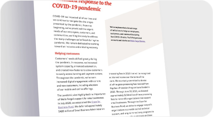 13 COVID-19 has impacted all of our lives and we continue to navigate the challenges presented by the pandemic . From the beginning, we’ve prioritized the urgent needs of our employees, customers, and communities, working tirelessly to address the many challenges we’ve faced during the pandemic . We remain dedicated to working toward an inclusive and enduring recovery . Helping customers Customers’ needs shifted greatly during the pandemic . In response, we increased system capacity, enhanced automation, and created new features to allow customers to easily access banking and payment options . Throughout the pandemic, we’ve seen increased digital engagement with current and new customers, including adoption of our mobile and online offerings . The pandemic also highlighted the importance of Wells Fargo’s support for small businesses . In July 2020, we established the Open for Business Fund . We deferred approximately $420 million of Small Business Administration Continued response to the COVID-19 pandemic We’ve implemented a broad range of initiatives to help our employees, customers, and communities during the COVID-19 crisis. You’ll find personal accounts and stories on Wells Fargo Stories. processing fees in 2020 that will be recognized as interest income over the terms of the loans . We voluntarily committed to donate all of the gross processing fees received from Paycheck Protection Program loans funded in 2020 . Through June 30, 2021, we donated approximately $234 million of these processing fees to nonprofit organizations that support small businesses . Through the Open for Business Fund, we strive to engage nonprofit organizations to provide capital, technical support, and long-term resiliency programs to small businesses, with an emphasis on those owned by diverse entrepreneurs . Customers can access additional information available through Wells Fargo’s COVID-19 resources website .