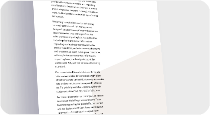 30 Tax overview Wells Fargo files income tax returns in the U .S . and over 30 additional countries and territories in which we operate . Our income tax profile reflects the commercial and regulatory considerations that drive our business structure and strategy . As a taxpayer in many jurisdictions, we’re routinely under examination by various tax authorities . Wells Fargo emphasizes a culture of strong internal controls and risk management designed to achieve compliance with applicable local income tax laws and regulations . We offer transparency with global tax authorities, including sharing relevant information regarding our business operations and tax profile . In addition, we’ve implemented systems and processes to assist in our global compliance with applicable customer tax information reporting laws, the Foreign Account Tax Compliance Act, and the Common Reporting Standard . Our consolidated financial statements include information related to the reconciliation of our effective tax rate to the U .S . statutory income tax rate and our net income taxes paid . In addition, we file publicly available legal entity financial statements in certain non-U .S . jurisdictions . For more information on the impact of income taxation at Wells Fargo, see our Income Taxes footnote regarding our global effective tax rate and our Statement of Cash Flows supplemental information for net cash taxes paid in our Annual Report . Our most up-to-date financial reports can be found here .