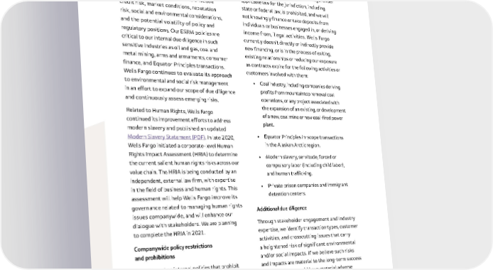 77 Sensitive industries We look at a full spectrum of risks and various other factors when we consider financing any sector, company, or project- specific transaction . These factors include credit risk, market conditions, reputation risk, social and environmental considerations, and the potential volatility of policy and regulatory positions . Our ESRM policies are critical to our internal due diligence in such sensitive industries as oil and gas, coal and metal mining, arms and armaments, consumer finance, and Equator Principles transactions . Wells Fargo continues to evaluate its approach to environmental and social risk management in an effort to expand our scope of due diligence and continuously assess emerging risks . Related to Human Rights, Wells Fargo continued its improvement efforts to address modern slavery and published an updated Modern Slavery Statement (PDF) . In late 2020, Wells Fargo initiated a corporate-level Human Rights Impact Assessment (HRIA) to determine the current salient human rights risks across our value chain . The HRIA is being conducted by an independent, external law firm, with expertise in the field of business and human rights . This assessment will help Wells Fargo improve its governance related to managing human rights issues companywide, and will enhance our dialogue with stakeholders . We are planning to complete the HRIA in 2021 . Companywide policy restrictions and prohibitions Wells Fargo has internal policies that prohibit lines of business from knowingly accepting or opening new accounts or relationships (or renewing existing accounts or relationships) with certain types of clients or industries . Additional prohibitions related to clients, products, or business activities may exist at the line of business level . Under these policies, any business or business activity that is illegal under applicable law for the jurisdiction, including state or federal law, is prohibited, and we will not knowingly finance or take deposits from individuals or businesses engaged in, or deriving income from, illegal activities . Wells Fargo currently doesn’t directly or indirectly provide new financing, or is in the process of exiting, existing relationships or reducing our exposure as contracts expire for the following activities or customers involved with them: • Coal industry, including companies deriving profits from mountaintop removal coal operations, or any project associated with the expansion of an existing, or development of a new, coal mine or new coal-fired power plant . • Equator Principles in-scope transactions in the Alaskan Arctic region . • Modern slavery, servitude, forced or compulsory labor (including child labor), and human trafficking . • Private prison companies and immigrant detention centers . Additional due diligence Through stakeholder engagement and industry expertise, we identify transaction types, customer activities, and crosscutting issues that carry a heightened risk of significant environmental and/or social impacts . If we believe such risks and impacts are material to the long-term success of companies or could have material adverse environmental or social impacts, we perform client-, industry-, issue-, or transaction-specific risk due diligence to evaluate a customer’s commitment, capacity, and track record as they relate to ESRM .
