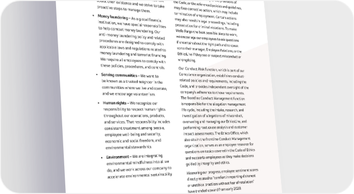 22 activities and personal transactions, finances, or relationships . Where conflicts can’t be avoided, we aim to be transparent about their existence and we strive to take proactive steps to manage them . • Money laundering – As a global financial institution, we have special responsibilities to help combat money laundering . Our anti-money laundering policy and related procedures are designed to comply with applicable laws and regulations related to money laundering and terrorist financing . We require all employees to comply with these policies, procedures, and controls . • Serving communities – We want to be known as a trusted neighbor in the communities where we live and operate, and we encourage volunteerism . • Human rights – We recognize our responsibility to respect human rights throughout our operations, products, and services . That responsibility includes consistent treatment among people, employee well-being and security, economic and social freedom, and environmental stewardship . • Environment – We are integrating environmental mindfulness into all we do, and we work across our company to accelerate environmental sustainability . We take violations of our Code seriously . Anyone who knowingly violates any of the provisions of the Code, or the referenced policies and guidelines, may face corrective action, which may include termination of employment . Certain actions may also result in legal proceedings, including prosecution for criminal violations . To make Wells Fargo the best possible place to work, we encourage our employees to ask questions if uncertain about the right path and to speak up to their manager, Employee Relations, or the EthicsLine if they see or suspect misconduct or wrongdoing . Our Conduct Risk function, which is part of our Compliance organization, establishes conduct- related policies and requirements, including the Code, and provides independent oversight of the company’s adherence to those requirements . The frontline Conduct Management function is responsible for the allegation management life cycle, including the intake, research, and investigation of allegations of misconduct, overseeing and managing our EthicsLine, and performing root cause analysis and customer impact assessments . The Ethics Office, which also sits in the frontline Conduct Management organization, serves as an employee resource for questions on topics covered in the Code of Ethics and supports employees as they make decisions guided by integrity and ethics . Measuring our progress, employee sentiment scores directly related to “comfort in reporting dishonest or unethical practices without fear of retaliation” have trended upward from early 2020 .