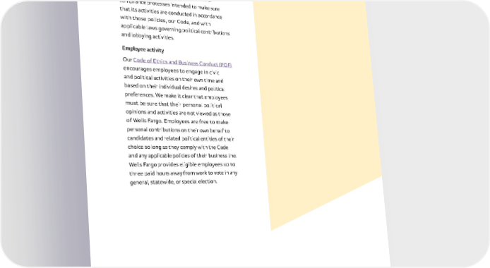 29 We have policies and procedures in place designed to help make sure that we comply with applicable laws regarding political contributions . Wells Fargo also maintains compliance processes intended to make sure that its activities are conducted in accordance with those policies, our Code, and with applicable laws governing political contributions and lobbying activities . Employee activity Our Code of Ethics and Business Conduct (PDF) encourages employees to engage in civic and political activities on their own time and based on their individual desires and political preferences . We make it clear that employees must be sure that their personal political opinions and activities are not viewed as those of Wells Fargo . Employees are free to make personal contributions on their own behalf to candidates and related political entities of their choice so long as they comply with the Code and any applicable policies of their business line . Wells Fargo provides eligible employees up to three paid hours away from work to vote in any general, statewide, or special election .