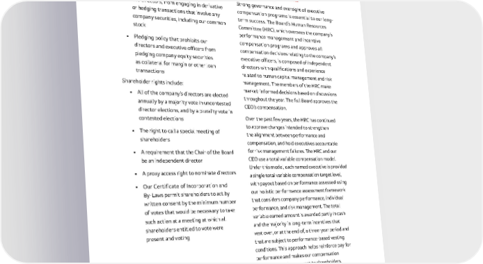 18 • Anti-hedging policies that prohibit all employees, including executive officers and directors, from engaging in derivative or hedging transactions that involve any company securities, including our common stock • Pledging policy that prohibits our directors and executive officers from pledging company equity securities as collateral for margin or other loan transactions Shareholder rights include: • All of the company’s directors are elected annually by a majority vote in uncontested director elections, and by a plurality vote in contested elections • The right to call a special meeting of shareholders • A requirement that the Chair of the Board be an independent director • A proxy access right to nominate directors • Our Certificate of Incorporation and By-Laws permit shareholders to act by written consent by the minimum number of votes that would be necessary to take such action at a meeting at which all shareholders entitled to vote were present and voting Executive compensation Strong governance and oversight of executive compensation programs is essential to our long- term success . The Board’s Human Resources Committee (HRC), which oversees the company’s performance management and incentive compensation programs and approves all compensation decisions relating to the company’s executive officers, is composed of independent directors with qualifications and experience related to human capital management and risk management . The members of the HRC make market-informed decisions based on discussions throughout the year . The full Board approves the CEO’s compensation . Over the past few years, the HRC has continued to approve changes intended to strengthen the alignment between performance and compensation, and hold executives accountable for risk management failures . The HRC and our CEO use a total variable compensation model . Under this model, each named executive is provided a single total variable compensation target level, with payout based on performance assessed using our holistic performance assessment framework that considers company performance, individual performance, and risk management . The total variable earned amount is awarded partly in cash and the majority in long-term incentives that vest over, or at the end of, a three-year period and that are subject to performance-based vesting conditions . This approach helps reinforce pay for performance and makes our compensation decisions more transparent to shareholders .