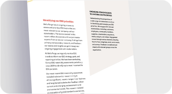 8 Identifying our ESG priorities Wells Fargo has an ongoing process to assess and prioritize ESG topics that are most relevant to our company and our stakeholders . The topics covered in this report reflect discussions with subject matter experts from across our company, findings from primary and secondary research, and feedback we receive and insights we gain through our ongoing engagement with stakeholders . At Wells Fargo, we regularly monitor ESG trends to inform our ESG strategy, goals, and reporting priorities . We have been conducting formal ESG materiality assessments periodically since 2009 to identify topics most important for ESG purposes . Our most recent ESG materiality assessment included substantial research in light of the significant, recent changes in our business and heightened stakeholder feedback about current and emerging socioeconomic and environmental trends . This research included an evaluation of global standard expectations, including the Global Reporting Initiative (GRI), the United Nations Sustainable Development Goals (SDGs), the Sustainable Accounting ENGAGING STAKEHOLDERS TO INFORM ESG PRIORITIES Understanding the perspectives of a wide range of stakeholders is critical to identifying and managing our ESG priorities. We engage with relevant stakeholders, including customers, employees, community members, suppliers, shareholders, regulators, media, analysts, and others. Engagement occurs through various channels, including face-to-face, telephone, email, social media, and surveys. Feedback is monitored and shared with relevant groups across the organization.