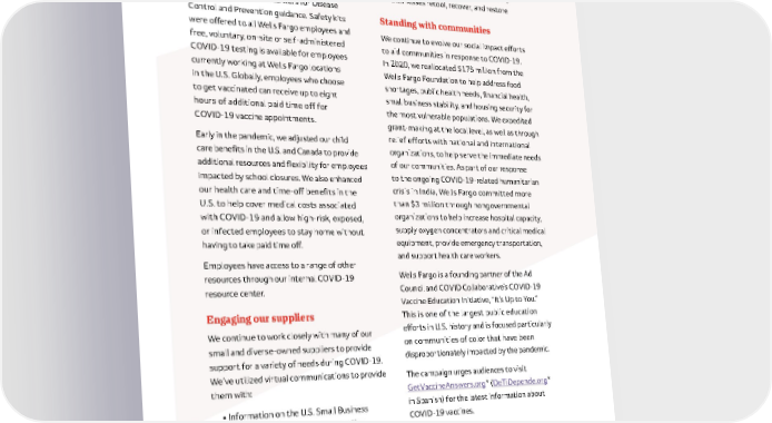 14 Supporting employees Keeping employees safe remains one of our top priorities . We have taken measures to enhance the safety in our offices and branch locations based on the Centers for Disease Control and Prevention guidance . Safety kits were offered to all Wells Fargo employees and free, voluntary, on-site or self-administered COVID-19 testing is available for employees currently working at Wells Fargo locations in the U .S . Globally, employees who choose to get vaccinated can receive up to eight hours of additional paid time off for COVID-19 vaccine appointments . Early in the pandemic, we adjusted our child care benefits in the U .S . and Canada to provide additional resources and flexibility for employees impacted by school closures . We also enhanced our health care and time-off benefits in the U .S . to help cover medical costs associated with COVID-19 and allow high-risk, exposed, or infected employees to stay home without having to take paid time off . Employees have access to a range of other resources through our internal COVID-19 resource center . Engaging our suppliers We continue to work closely with many of our small and diverse-owned suppliers to provide support for a variety of needs during COVID-19 . We’ve utilized virtual communications to provide them with: • Information on the U .S . Small Business Administration’s Paycheck Protection Program (PPP) • Context on the economic impacts of COVID-19 • Grants to help support businesses across the U .S . through the pandemic • U .S . capacity-building programs to help businesses retool, recover, and restore Standing with communities We continue to evolve our social impact efforts to aid communities in response to COVID-19 . In 2020, we reallocated $175 million from the Wells Fargo Foundation to help address food shortages, public health needs, financial health, small business stability, and housing security for the most vulnerable populations . We expedited grant-making at the local level, as well as through relief efforts with national and international organizations, to help serve the immediate needs of our communities . As part of our response to the ongoing COVID-19-related humanitarian crisis in India, Wells Fargo committed more than $3 million through nongovernmental organizations to help increase hospital capacity, supply oxygen concentrators and critical medical equipment, provide emergency transportation, and support health care workers . Wells Fargo is a founding partner of the Ad Council and COVID Collaborative’s COVID-19 Vaccine Education Initiative, “It’s Up to You .” This is one of the largest public education efforts in U .S . history and is focused particularly on communities of color that have been disproportionately impacted by the pandemic . The campaign urges audiences to visit GetVaccineAnswers .org * ( DeTiDepende .org * in Spanish) for the latest information about COVID-19 vaccines . *We do not control this website . Wells Fargo has provided this link for your convenience, but does not endorse and is not responsible for the content, links, privacy policy, or security policy of this website .