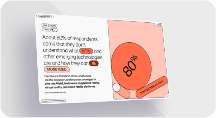 About 80% of respondents admit that they don’t understand what and other emerging technologies are and how they can . Creatives in Colombia, Brazil, and Mexico are the exception, professionals are eager to dive into Web3, Metaverse, augmented realit y, vir tual realit y, and mixed realit y plat forms. NF t s be mone tized O n e t h i n g M o r e Source: WeTransfer Ideas Repor t 2022 Rewriting romantic my ths of the creative industr y 41 5 — Autonomy 80 % Don’ t understand nf t s