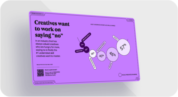 Creatives want to work on saying “no” In an industr y that has always valued creatives who are hungr y for more, saying no is finally the #1 underrated skill creatives want to master. 29 % 35 % 38 % 40 % 46 % 57 % r e so lv i n g c o n f l i ct N e g ot i at i n g P r e s e n tat i o n s k i l l s B e i n g k i n d B u i l d i n g r e l at i o n s h i p s S ay i n g N O SCALE INDICATES R ANKING Most underr ated workpl ace skills, r anked Source: WeTransfer Ideas Repor t 2022 Need a quick break ? Scan to get an interactive version of this data visualization (ooh). Rewriting romantic my ths of the creative industr y 29 3 — Boundaries