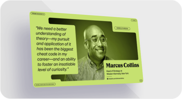 “We need a better understanding of theor y—my pursuit and application of it has been the biggest cheat code in my career— and an abilit y to foster an insatiable level of curiosit y.” Words of wisdom Marcus Collins Head of Strategy at Wieden+Kennedy, New York linkedin.com/in/marctothec Rewriting romantic my ths of the creative industr y 33 4 — Grow th