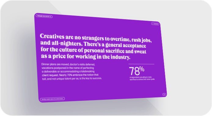 Creatives are no strangers to over time, r ush jobs, and all-nighters. There’s a general acceptance for the culture of personal sacrifice and sweat as a price for working in the industr y. Dinner plans are moved, doctor’s visits deferred, vacations postponed in the name of per fecting a deliverable or accommodating a latebreaking client request . Nearly 70% embrace the notion that toil, and not unique talent per se, is the key to s uccess. of respondents are willing to make sacrifices to achieve their career goals 78 % Rewriting romantic my ths of the creative industr y 24 3 — Boundaries
