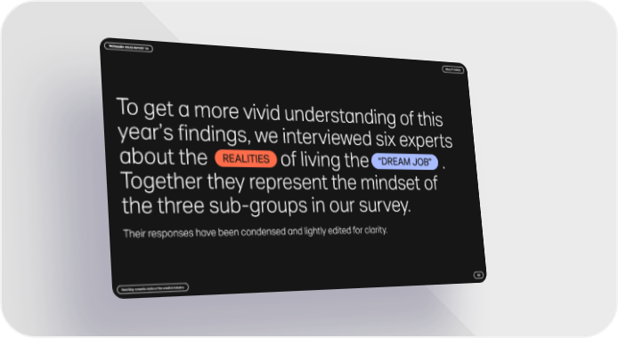 Their responses have been condensed and lightly edited for clarity. To get a more vivid understanding of this year’s findings, we interviewed six experts about the of living the . Together they represent the mindset of the three sub-groups in our survey. realities “dream job” Rewriting romantic myths of the creative industry 43 Reality check