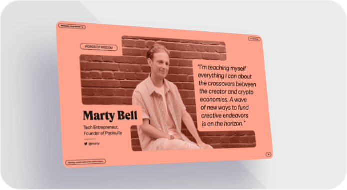 Marty Bell Tech Entrepreneur, Founder of Poolsuite “I’m teaching myself ever y thing I can about the crossovers bet ween the creator and cr ypto economies. A wave of new ways to fund creative endeavors is on the horizon.” Words of wisdom @mar t y Rewriting romantic my ths of the creative industr y 39 5 — Autonomy