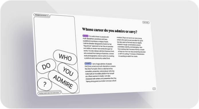 ? Admire do you who Whose career do you admire or env y ? I’m really drawn to people with multi- disciplinar y practices and have a plat form to produce a range of work . I admire [theater designer] Es Devlin for her “big picture” approach to her fine ar t practice and abilit y to render new worlds through her works. I’ve also always admired Garance Doré, who evolved from being an illustrator, a street st yle photographer, and an author to creating a plat form and communit y called Doré. I am a huge admirer of peopl e that have varied and multi- disciplinar y careers like Ziwe Fumudoh. She’s a talented writer, comedian, presenter, and producer who has really built an incredible plat form for herself as a Black woman in media. I am also obsessed with writers and presenters like Zing Tsjeng doing great journalism and pop culture analysis. Zing is an icon to so many young writers who want to use journalism for good but also want to find new ways to reignite interest in tough conversations around colonialism, identit y, and belonging. I also find creatives like Francesca Ramsy a breath of fresh air; from her days presenting decoded on MT V to writing T V shows on Nickelodeon it is exciting to watch her create. Olivia Chanté Rewriting romantic my ths of the creative industr y 51 Re alit y check