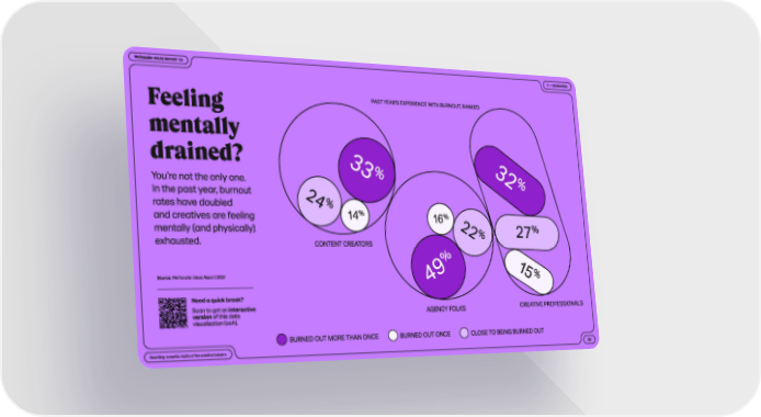 Feeling mentally drained? You’re not the only one. In the past year, burnout rates have doubled and creatives are feeling mentally (and physically) exhausted. Burned out more than once Burned out once Close to being burned out 49 % 22 % 16 % Agency folks 33 % 24 % 14 % Content Cre ators Cre ative Profes sionals 32 % 27 % 15 % Source: WeTransfer Ideas Repor t 2022 Need a quick break ? Scan to get an interactive version of this data visualization (ooh). past ye ar's e xperience with b urnout, r anked Rewriting romantic my ths of the creative industr y 26 3 — Boundaries