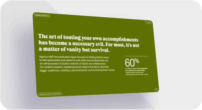 The ar t of touting your own accomplishments has become a necessar y evil. For most, it’s not a matter of vanity but sur vival. Agency staff are par ticularly hyper-focused on findin g distinct ways to feel appreciated and valued at work while solo p rofessionals rely on self-promotion to build a net work of clients and collaborators. For content creators, mastering social media is the key to reaching bigger audiences, creating a personal brand, and in creasing their income. of content creators do not generate any revenue from social media, despite seeing it as their best oppor tunit y to maximize their income. 60 % Rewriting romantic my ths of the creative industr y 31 4 — Grow th