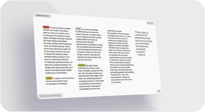 I’d love to be able to detach my work and my life. To be able to view my career as a job like a lot of my friends do. To be able to entirely switch off at 6pm and enter ‘personal life’ mode. Please send advice! I do have a problem with working too much, but mostly because I love it ... but it’s also impor tant to switch off, to touch grass, to swim in the sea, to wander the streets of Lisbon aimlessly without a phone for six hours on a Saturday af ternoon. I’m teaching myself ever y thing I can about the crossovers bet ween the creator and cr ypto economies, as a wave of new ways to fund creative endeavors is on the horizon. We need a better understanding of theor y and to foster insatiable curiosit y. We of ten say, “Oh, that works in theor y but ...” when the truth of the matter is that there is an underlying physics to ever y thing around us. Theor y helps us understand the phenomenal world and how to leverage the controllables that drive more predictable outcomes. My acquisition of theor y has been the biggest cheat code in my career. This is why I star ted a pursuit in academia to complement and augment my practice. The t wo together is a lethal combination. The better we know people, the better our chances of influencing them, which is the core function of marketing. This, of course, requires that we move from a state of cer taint y to a state of curiosit y. This is a state where we obser ve what's around us with inquisitiveness. Comedians are the best at this, by the way. They spend their days just watching people until something makes them go, “hmm, that was interesting.” Perspective and proximit y is key to the future of our industr y. I’m great at communication, I love to chat and tell a stor y. I’m working on my listening. I'm currently interested in understanding more about the media landscape as I believe there's a lot of untapped potential in getting creative with the new ways we stream content . Branded enter tainment is something I'm diving into, and excited about the potential to tell meaningful brand stories with a myriad of creators. At the end of the day, I strive to make ads that enter tain and educate rather than interrupt and annoy. Mart y Marcu s r aven Myr a “Theor y helps us understand the phenomenal world and how to leverage the controllables that drive more predictable outcomes.” — Marcus Rewriting romantic my ths of the creative industr y 48 Re alit y check