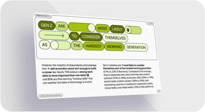 Gen z To Themselves Gener ation as The hardest Are Most Consider working Likely However, the majorit y of respondents acknowledge that self-promotion alone isn’t enough to build a career on. Nearly 70% believe a strong work ethic is more impor tant than raw talent and 80% say that learning “timeless skills” that can weather the tides of technology is crucial. Gen Z creatives are most likely to consider themselves par t of the hardest working generation (31% vs 22% of Boomers). Compared to the average, they ’re especially keen about learning new creative sof t ware (42% vs 39%), production skills (23% vs 19 %), social media content creation (36% vs 29%), and developing exper tise in building for augmented real it y, vir tual realit y, and mixed realit y (10% vs 9%) plat forms. Rewriting romantic my ths of the creative industr y 32 4 — Grow th