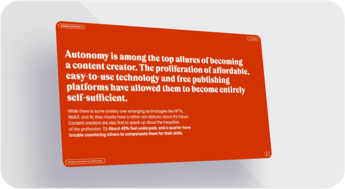 Autonomy is among the top allures of becoming a content creator. The proliferation of affordable, easy-to-use technology and free publishing platforms have allowed them to become entirely self-sufficient. While there is some anxiet y over emerging technolog ies like NFTs, Web3, and AI, they mostly have a rather zen attitud e about the future. Content creators are also first to speak up about th e inequities of the profession. About 40% feel underpaid, and a quar ter have trouble convincing others to compensate them for th eir skills. Rewriting romantic my ths of the creative industr y 37 5 — Autonomy