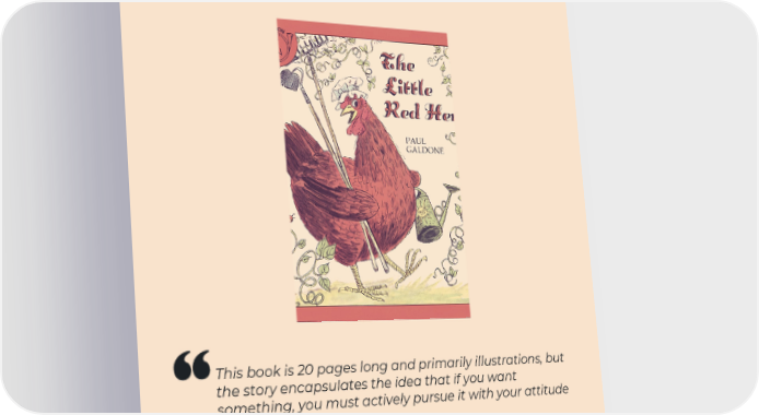 The Little Red Hen by Paul Galdone This book is 20 pages long and primarily illustrations, but the story encapsulates the idea that if you want something, you must actively pursue it with your attitude and effort. You cannot wait or rely on someone else to give it to you. I remember my mum reading it to me when I was little, and it shaped my mentality up until today, when I frequently referenced it while running 11:FS.