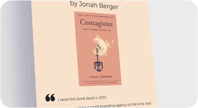 Contagious: Why Things Catch On by Jonah Berger I read this book back in 2013. I was operating a small branding agency at the time, and that book was a turning point for me. It sparked my ongoing obsession with understanding buyer behavior. Humans are complex creatures, yet when you invest time to understand better why we do what we do, you'll find clues that can help you to market smarter.