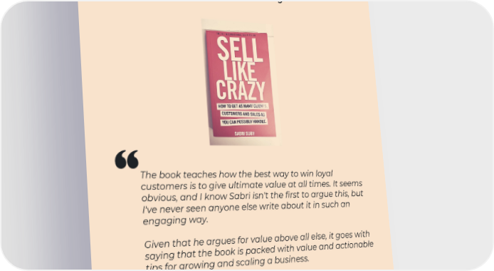 Sell Like Crazy by Sabri Suby The book teaches how the best way to win loyal customers is to give ultimate value at all times. It seems obvious, and I know Sabri isn't the first to argue this, but I've never seen anyone else write about it in such an engaging way. Given that he argues for value above all else, it goes with saying that the book is packed with value and actionable tips for growing and scaling a business. Although it's a little heavy-handed in some places and a little too on the sales-y side for me sometimes, the principles and psychology behind what Sabri writes changed the way I approach sales and marketing, and they're principles that I'll carry through the rest of my career.
