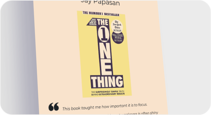 The One Thing by Gary W. Keller and Jay Papasan This book taught me how important it is to focus. As an entrepreneur, our biggest weakness is often shiny object syndrome, which keeps us on a hamster wheel, always looking at the next thing without giving the current thing time to mature. The book shifted my perspective and helped me stay focused and cast 'shiny object' distractions aside.
