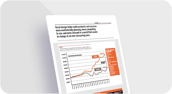 fEATURE what is the reaL vaLUe OF desiGn? Great design helps make products and services more aesthetically pleasing, more compelling to use, and more relevant in a world that seems to change at an ever-increasing pace. fIGURE 1 A $10,000 investment in our design index of diverse design-centric companies would have yielded returns 228% higher than the same investment in the S&P over the same amount of time. $45,000 DesIgn ConCIous DmI DesIgn-CenTRIC InDex CompanIes: $40,000 $39,922.89 Apple D.InDex CoCA-ColA $35,000 Ford HermAn-mIller IBm $30,000 % IntUIt 228 newell-rUBBermAId $25,000 nIke proCter & GAmBle $20,000 $17,522.15 StArBUCkS s&p InDex StArwood $15,000 SteelCASe tArGet $10,000 wAlt dISney wHIrlpool $5,000 07 07 10 10 11 11 12 12 13 13 03 03 04 04 05 05 06 06 ’ ’ 08 08 09 09 ’ ’ ’ ’ ’ ’ ’ ’ ’ ’ ’ ’ ’ ’ ’ ’ C ’ ’ ’ ’ C C C C C C C C e C C e e e e Jun e e Jun e e Jun D e e Jun D Jun D Jun D Jun D D Jun D D Jun D Jun D Jun D fIGURE 2 DesIgn InDex CompaReD To s&p InDex The companies comprising our design index outperformed full peRIoD Bull maRkeT BeaR maRkeT CuRRenT peRIoD the S&P over a 10-year period (10/09/02 – (10/09/07 – (03/05/09 – encompassing a bull market 10/08/07) 03/05/09) pResenT) (October 9, 2002-October 8, Design-Centric Index 2007), a bear market % % % % (October 9, 2007-March 5, aBsoluTe +299 +112 –28 +222 2009), and the current period peRfoRmanCe S&P Index (March 5, 2009-present). +75% +67% –37% +99% DesIgn- CenTRIC InDex % % % % peRfoRmanCe +224 +45 +9 +123 RelaTIve To s&p DMI Winter 2013 33