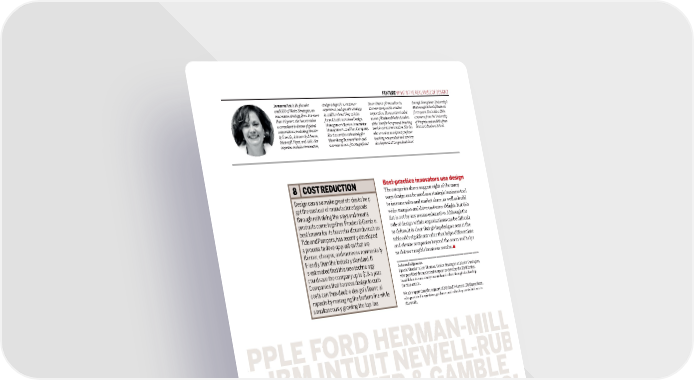 fEATURE what is the reaL vaLUe OF desiGn? Jeneanne Rae is the founder design integration, customer Seven Gurus of Innovation in through Georgetown University’s and CEO of Motiv Strategies, an experience, and growth strategy. its cover story on the creative McDonough School of Business innovation strategy firm. For more In addition to writing articles corporation. She was later hailed for 10 years. She holds a BS in than 20 years, she has served as for publications such as Design as one of BusinessWeek’s Leaders commerce from the University a consultant to dozens of global Management Review, Innovation of the Year for her ground-breaking of Virginia and an MBA from corporations, including Procter Management, and Fast Company, work in service innovation. She has Harvard Business School. & Gamble, Johnson & Johnson, Rae has written extensively for also served as an adjunct professor Microsoft, Pepsi, and AIG. Her Bloomberg BusinessWeek and teaching new product and services expertise includes innovation, was named one of its Magnificent development at the graduate level 8 CosT ReDuCTIon Best-practice innovators use design The categories above suggest eight of the many Design can also make great strides to help ways design can be used as a strategic business tool get the cost out of manufactured goods to increase sales and market share, as well as build through rethinking the ways and means wider margins and drive customer delight. But this products come together. Procter & Gamble, list is not by any means exhaustive. Although the best known for its household brands such as role of design within organizations can be difficult tide and Pampers, has recently developed to define, it is clear that giving design a seat at the a process to develop plastics that are table adds significant value that helps differentiate thinner, cheaper, and more environmentally and elevate companies beyond the norm and helps friendly than the industry standard. it to deliver tangible business results. is estimated that this new technology Acknowledgments could save the company up to $1B a year. Special thanks to Joy Thomas, Senior Strategist at Motiv Strategies, Companies that harness design to curb who provided the analytical support to develop the DMI Index, costs can thus double design’s financial in addition to case study research and other thought leadership for this article. impacts by managing the bottom line while We also appreciate the support of Michael Westcott, DMI president, simultaneously growing the top line. who provided inspiration, guidance, and other key contributions to this work. APPlE ForD HErMAN-MIllEr IBM INTuIT NEWEll-ruBBErMAID NIKE ProCTEr & gAMBlE STArBuCKS STArWooD STEElCASE CoCA-ColA WAlT DISNEY WHIrlPool APPlE ForD HErMAN-MIllEr IBM INTuIT NEWEll-ruBBErMAID NIKE ProCTEr & DMI Winter 2013 37 gAMBlE STArBuCKS STArWooD STEElCASE CoCA-ColA WAlT DISNEY APPlE ForD HEr