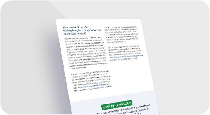 What can I do if I enroll in a You can contact your plan to request an exception for Marketplace plan, but my doctor isn’t out-of-network care to be covered like in-network care. in my plan’s network? You may also qualify as a continuing care patient if you’re getting treatment from a provider or facility and If you enroll in a Marketplace plan and find out that your health plan terminates your provider’s contract. your doctor isn’t in the plan’s network, you can switch Contact your plan to see if you qualify for in-network to another plan until the date your coverage starts. Find exceptions or continuity of care. out when your new coverage starts before you cancel your current plan, so you won’t have a gap in coverage. If you go to your doctor and find out later that your If you decide to switch plans, make sure your doctor is new plan doesn’t cover your doctor or doesn’t pay for in your new plan’s provider network. You can find a link the visit, you have the right to appeal the decision and to a list of providers in each plans’ network in the plan have it reviewed by an independent third party. Visit description in your Marketplace account. You can also HealthCare.gov/appeal-insurance-company-decision/ contact your health insurance company to see which appeals/ to learn about the appeals process. doctors, hospitals, and other health care providers are in your plans’ network. After your coverage starts, you won’t be able to change your plan until the next Open Enrollment, unless you get a Special Enrollment Period because you experience certain life events. Qualifying life events include losing health coverage, getting married, moving, or having a baby. Visit HealthCare.gov/reporting-changes if you need to update your application because of a life event. HOW CAN I LEARN MORE? To learn more about coverage through the Marketplace or your benefits and protections, visit HealthCare.gov or call the Marketplace Call Center at 1-800-318-2596. TTY users can call 1-855-889-4325. You have the right to get Marketplace information in an accessible format, like large print, Braille, or audio. You also have the right to file a complaint if you feel you’ve been discriminated against. Visit CMS.gov/about-cms/agency-information/aboutwebsite/cmsnondiscriminationnotice, or call the Marketplace Call Center at 1-800-318-2596 for more information. TTY users can call 1-855-889-4325. CMS Product No. 11766 Revised February 2022 This product was produced at U.S. taxpayer expense. ® Health Insurance Marketplace is a registered service mark of the U.S. Department of Health & Human Services.