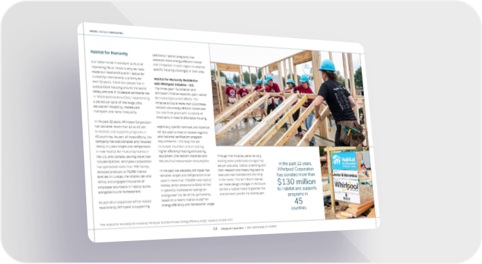 SOCIAL / LOCAL COMMUNITIES Habitat for Humanity Our vision to be in constant pursuit of improving life at Home is why we have made our relationship with Habitat for Humanity International a priority for over 22 years. 1.6 billion people live in substandard housing around the world today, and one in 10 people worldwide live in “distressed communities,” experiencing a perpetual cycle of low-wage jobs, education instability, inadequate transport and racial inequality. In the past 22 years, Whirlpool Corporation has donated more than $130 million to Habitat and supports programs in 45 countries. As part of these efforts, the company has also donated and installed nearly 212,000 ranges and refrigerators in new Habitat for Humanity homes in the U.S. and Canada, serving more than 120,000 families. Whirlpool Corporation has sponsored more than 190 homes; donated products to 76,000 Habitat families in Europe, the Middle East and Africa; and engaged thousands of employee volunteers in Habitat builds alongside future homeowners. As part of an expansion of the Habitat relationship, Whirlpool is supporting In the past 22 years, Whirlpool Corporation has donated more than $130 million to Habitat and supports programs in 45 countries. additional Habitat programs that advocate more energy-efficient homes and innovation in each region to address specific housing challenges in their area. Habitat for Humanity BuildBetter with Whirlpool Initiative—U.S. The three-year “BuildBetter with Whirlpool” initiative expands upon Habitat for Humanity’s current efforts. The initiative will build more than 250 climate- resilient and energy-efficient homes over the next three years with hundreds of Americans in need of affordable housing. Regionally, specific methods and materials will be used to meet or exceed regional and national verification program requirements. This may include increased insulation and air sealing, higher efficiency heating and cooling equipment, fire resilient materials and fixtures that reduce water consumption. In the past two decades, Whirlpool has donated ranges and refrigerators to be used in more than 110,000 new Habitat homes, which amounts to $24.6 million in potential homeowner savings on energy over the life of the partnership, based on a recent Habitat study* on energy efficiency and homeowner usage. Through this initiative, we’re not only making some predictable changes that we can calculate, Habitat is working with their research and measuring team to evaluate how homeowners are living in the home. This will inform how we can make design changes in the future so that a Habitat home is good for the environment and for the homebuyer. *Per Habitat for Humanity for Humanity “Whirlpool Donated Product Energy Efficiency Study”, issued in October 2021. Whirlpool Corporation / 2021 SUSTAINABILITY REPORT 64