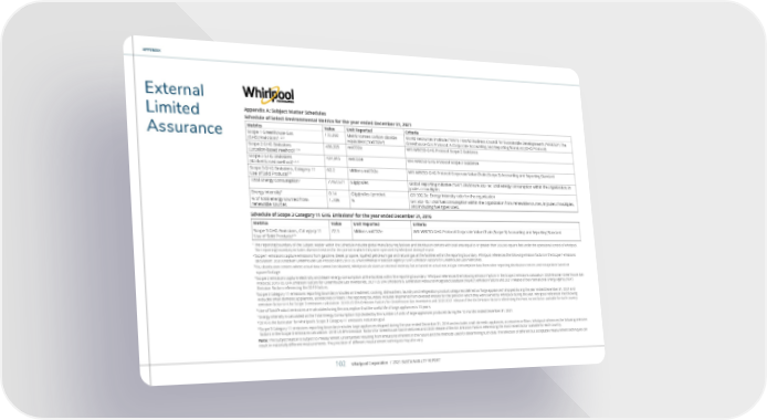 APPENDIX / OUR ESG APPROACH APPENDIX External Limited Assurance Appendix A: Subject Matter Schedules Schedule of Select Environmental Metrics for the year ended December 31, 2021 Metrics Value Unit Reported Criteria Scope 1 Greenhouse Gas (GHG) Emissions 1, 2, 3 172,392 Metric tonnes carbon dioxide equivalent (“mtCO2e”) World Resources Institute (“WRI”) / World Business Council for Sustainable Development’s (“WBCSD”) The Greenhouse Gas Protocol: A Corporate Accounting and Reporting Standard (GHG Protocol) Scope 2 GHG Emissions (Location-based method) 1, 3, 4 438,325 mtCO2e WRI WBCSD GHG Protocol Scope 2 Guidance Scope 2 GHG Emissions (Market-based method) 1, 3, 4 424,945 mtCO2e WRI WBCSD GHG Protocol Scope 2 Guidance Scope 3 GHG Emissions, Category 11 Use of Sold Products 5, 6 62.2 Millions mtCO2e WRI WBCSD GHG Protocol Corporate Value Chain (Scope 3) Accounting and Reporting Standard Total Energy Consumption 1 7,467,571 Gigajoules Global Reporting Initiative (“GRI”) Disclosure 302-1e: Total energy consumption within the organization, in joules or multiples Energy Intensity 7 0.14 Gigajoules / product GRI 302-3a: Energy intensity ratio for the organization % of total energy sourced from renewable sources 1.70% % GRI 302-1b: Total fuel consumption within the organization from renewable sources, in joules of multiples, and including fuel types used. Schedule of Scope 3 Category 11 GHG Emissions 8 for the year ended December 31, 2016 Metrics Value Unit Reported Criteria Scope 3 GHG Emissions, Cat-egory 11 Use of Sold Products 6, 9 72.3 Millions mtCO2e WRI WBCSD GHG Protocol Corporate Value Chain (Scope 3) Accounting and Reporting Standard 1 The reporting boundary of the Subject Matter within the Schedule includes globa l manufacturing facilities and distribution centers with total area equal to or greater than 500,000 square feet under the operational control of Whirlpool. The reporting boundary includes divested entities for the period in which they were operated by Whirlpool during the year. 2 Scope 1 emissions capture emissions from gasoline, diesel, propane, liquified pet roleum gas and natural gas at the facilities within the reporting boundary. Whirlpool references the following emission factors in the Scope 1 emissions calculation: 2020 Brazilian Greenhouse Gas Protocol and 2019 US Environmental Protection Agency (“EPA”) Emission Factors for Greenhouse Gas Inventories. 3 For distribution centers where actual data cannot be obtained, Whirlpool calculates an internal intensity factor based on actual natural gas consumption data from other reporting distribution centers and extrapolates based on square footage. 4 Scope 2 emissions capture electricity and steam energy consumption at the facili ties within the reporting boundary. Whirlpool references the following emission factors in the Scope 2 emissions calculation: 2020 Brazilian Greenhouse Gas Protocol, 2019 US EPA Emission Factors for Greenhouse Gas Inventories, 2021 US EPA Emissions & Generation Resource Integrated Database (“eGRID”) emission factors and 2021 release of the International Energy Agency (“IEA”) Emission Factors referencing the 2019 factors. 5 Scope 3 Category 11 emissions reporting boundary includes air treatment, cookin g, dishwashers, laundry and refrigeration product categories (defined as “large appliances”) shipped during the year ended December 31, 2021 and excludes small domestic appliances, accessories or filters. The reporting boundary includes shipments from divested entities for the period in which they were owned by Whirlpool during the year. Whirlpool references the following emission factors in the Scope 3 emissions calculation: 2018 US EPA Emission Factors for Greenhouse Gas Inventories and 2020 2021 release of the IEA Emission Factors referencing the most recent factor available for each country. 6 Use of Sold Product emissions are calculated using the assumption that the useful life of large appliances is 10 years. 7 Energy intensity is calculated as the Total Energy Consumption (GJ) divided by the number of units of large appliances produced during the 12 months ended December 31, 2021. 8 2016 is the base year for Whirlpool’s Scope 3 Category 11 emissions reduction go al 9 Scope 3 Category 11 emissions reporting boundary includes large appliances shipped during the year ended December 31, 2016 and excludes small domestic appliances, accessories or filters. Whirlpool references the following emission factors in the Scope 3 emissions calculation: 2018 US EPA Emission Factors for Greenhouse Gas Inventories and 2020 release of the IEA Emission Factors referencing the most recent factor available for each country. Note: The Subject Matter is subject to measurement uncertainties resulting from limitations inherent in the nature and the methods used for determining such data. The selection of different but acceptable measurement techniques can result in materially different measurements. The precision of different measurement techniques may also vary. Whirlpool Corporation / 2021 SUSTAINABILITY REPORT 102 Whirlpool Corporation / 2021 SUSTAINABILITY REPORT 102 Whirlpool Corporation / 2021 SUSTAINABILITY REPORT 102