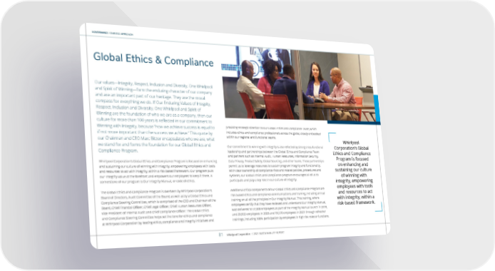 GOVERNANCE / OUR ESG APPROACH Global Ethics & Compliance Our values—Integrity, Respect, Inclusion and Diversity, One Whirlpool and Spirit of Winning—form the enduring character of our company and are an important part of our heritage. They are the moral compass for everything we do. If Our Enduring Values of Integrity, Respect, Inclusion and Diversity, One Whirlpool and Spirit of Winning are the foundation of who we are as a company, then our culture for more than 100 years is reflected in our commitment to Winning with Integrity, because “how we achieve success is equal to if not more important than the success we achieve.” This quote by our Chairman and CEO Marc Bitzer encapsulates who we are, what we stand for and forms the foundation for our Global Ethics and Compliance Program. Whirlpool Corporation’s Global Ethics and Compliance Program is focused on enhancing and sustaining our culture of winning with integrity, empowering employees with tools and resources to act with integrity, within a risk-based framework. Our program puts our Integrity value at the forefront and empowers our employees to keep it there. A cornerstone of our program is Our Integrity Manual, or code of ethics. The Global Ethics and Compliance Program is overseen by Whirlpool Corporation’s Board of Directors, Audit Committee of the Board, as well as by a Global Ethics and Compliance Steering Committee, which is comprised of the CEO and Chairman of the Board, Chief Financial Officer, Chief Legal Officer, Chief Human Resources Officer, Vice President of Internal Audit and Chief Compliance Officer. The Global Ethics and Compliance Steering Committee helps set the tone for ethics and compliance at Whirlpool Corporation by leading ethics, compliance and integrity initiatives and providing strategic direction to our Global Ethics and Compliance Team, which includes ethics and compliance professionals across the globe, closely embedded within our regional and functional teams. Our commitment to winning with integrity is also reflected by strong cross-functional leadership and partnerships between the Global Ethics and Compliance Team and partners such as Internal Audit, Human Resources, Information Security, Data Privacy, Product Safety, Global Sourcing, and other teams. These partnerships permit us to leverage resources to sustain program integrity and functionality. With clear ownership of compliance risks and related policies, procedures and systems, our Global Ethics and Compliance program encourages all of us to participate and play a key role in our culture of integrity. Additional critical components of our Global Ethics and Compliance Program are risk-based ethics and compliance communications and training, including annual training on all of the principles in Our Integrity Manual. This training, where employees certify that they have reviewed and understand Our Integrity Manual, was delivered to 57,000 employees as part of the Integrity Manual launch in 2019, and 20,933 employees in 2020 and 19,570 employees in 2021 through refresher trainings, including 100% participation by employees in high risk roles or functions. Whirlpool Corporation’s Global Ethics and Compliance Program is focused on enhancing and sustaining our culture of winning with integrity, empowering employees with tools and resources to act with integrity, within a risk-based framework. Whirlpool Corporation / 2021 SUSTAINABILITY REPORT 81