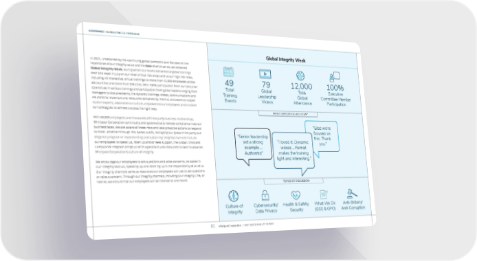 GOVERNANCE / GLOBAL ETHICS & COMPLIANCE In 2021, undeterred by the continuing global pandemic and focused on the importance of our integrity value and the How of what we do, we delivered Global Integrity Week , during which our teams delivered targeted trainings over one week in July on our most critical risk areas and to our high-risk roles, including 49 interactive, virtual trainings to more than 12,000 employees across 40 countries and more than 250 cities. With 100% participation from our Executive Committee in various trainings and participation from global leaders ranging from managers to vice presidents, the dynamic trainings, videos, communications and educational materials and resources delivered by internal and external subject matter experts, advanced our culture, empowered our employees and enabled our colleagues to achieve success the right way. With 69,000 employees and thousands of third-party business relationships, Whirlpool Corporation continually and systematically reviews compliance risks our business faces. We are aware of these risks and take proactive actions to respond to them. Whether through risk-based audits, managing our global third-party due diligence program or implementing and sustaining integrity channels that aid our employees to speak up, listen up and/or seek support, the Global Ethics and Compliance Program brings all of its operations and resources to bear to advance Whirlpool Corporation’s culture of integrity. We encourage our employees to ask questions and voice concerns. As stated in Our Integrity Manual, speaking up and listening up is the responsibility of all of us. Our integrity channels serve as resources our employees can use to ask questions or raise a concern. Through our integrity channels, including Our Integrity Line, or hotline, we ensure that our employees will be listened to and heard. Global Integrity Week 79 Global Leadership Videos 12,000 Total Global Attendance 49 Total Training Events 100% Executive Committee Member Participation “Senior leadership set a strong example ... Authentic!” “I loved it. Dynamic videos ... format makes the training light and interesting.” Culture of Integrity Cybersecurity/ Data Privacy Health & Safety, Security What We Do (GSS & GPO) Anti-Bribery/ Anti-Corruption “Glad we’re focused on this. Thank you.” WHAT EMPLOYEES HAD TO SAY TOPICS OF DISCUSSION Whirlpool Corporation / 2021 SUSTAINABILITY REPORT 82