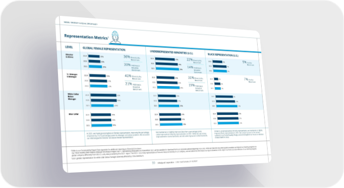 SOCIAL / DIVERSITY & EQUAL OPPORTUNITY 1 Refer to our Sustainability Report Data Appendix for additional reporting on Diver sity & Inclusion. Our most recently filed Federal Employer Information Report EEO-1, representing employees as of December 2021, will be available for download from our corporate website beginning in Q2 2022. While we make the document publicly available, we measure our diversity progress as a global company differently from the U.S.-only view provided by the EEO-1 report. The EEO-1 is not fully representative of how we measure diversity in our company, and we believe the information we report elsewhere in this report is a more accurate reflection of our diversity progress. 2 2021 gender representation for white collar below manager adversely affected by China divestiture. Representation Metrics 1 Director & Above In 2021, we made good progress on female representation, improving the percentage of women by 2 to 3 percentage points for Manager and above positions. We exceeded our internal goal for Director and above female representation. 2019 25% 2020 26% 2021 29% GLOBAL FEMALE REPRESENTATION LEVEL 2019 31% 2020 33% 2021 33% 2019 50% 2020 50% 2021 43% 2 2019 38% 2020 38% 2021 39% 36% Diversity Inc. Benchmark 20% McKinsey’s Industrial Benchmark 41% Diversity Inc. Benchmark 21% McKinsey’s Industrial Benchmark Sr. Manager & Manager White Collar Below Manager Blue Collar We maintained or slightly improved (less than a percentage point) underrepresented minority representation in 2021. While we saw strong improvement in some functions, we lost a bit of ground in other functions. 2019 22% 2020 25% 2021 26% UNDERREPRESENTED MINORITIES (U.S.) 2019 20% 2020 23% 2021 24% 2019 20% 2020 21% 2021 23% 2019 24% 2020 24% 2021 25% 22% Diversity Inc. Benchmark 14% McKinsey’s Industrial Benchmark 31% Diversity Inc. Benchmark 19% McKinsey’s Industrial Benchmark Similar to underrepresented minority representation, we maintained or slightly improved Black representation in 2021. We remain focused on the actions outlined in our Racial Equality Pledge, and will strengthen our focus on retention of Black talent in 2022. 2019 5% 2020 7% 2021 7% BLACK REPRESENTATION (U.S.) 2019 2% 2020 3% 2021 3% 2019 9% 2020 10% 2021 11% 2019 11% 2020 11% 2021 11% 5% OneTen Benchmark 7% OneTen Benchmark Whirlpool Corporation / 2021 SUSTAINABILITY REPORT 59