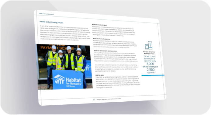 SOCIAL / LOCAL COMMUNITIES Habitat Global Housing Forums As part of the House+Home World Tour, Whirlpool Corporation is sponsoring three Habitat global housing forums. The forums bring together a spectrum of leaders and experts to spur innovation aimed at meeting the housing needs of the planet’s growing population, while also addressing challenges related to increasing severe weather events and changing climate norms. Each initiative is individual to their country, such as Poland and the U.K.’s support of Habitat for Humanity’s Safe Places program where empty buildings are rehabilitated into multi-family housing units. Habitat for Humanity Brazil In collaboration with Consulado da Mulher and Habitat for Humanity, we provided 18 critical home repairs related to the prevention of COVID-19 in the community of Heliópolis in São Paulo. This resulted in 64 people living in rehabilitated homes. Forty women participated in the Consulado da Mulher entrepreneurship training, directly impacting jobs and sales of local businesses in communities. Habitat for Humanity Argentina Whirlpool Corporation worked with Habitat for Humanity to identify and execute 125 home repairs (electrical, water, sanitation, roof) in Pilar, Buenos Aires. In addition, repairs were made to three community centers that are responsible for providing food assistance to the community and education to the younger population. Habitat et Humanisme in Whirlpool France In France, Whirlpool Corporation celebrates 11 years of partnership with Habitat et Humanisme. Whirlpool Corporation collaborates with the association to provide access to decent, low-cost housing in the city and to contribute to social diversity by choosing housing in mixed culture neighborhoods within urban areas. In the last 11 years we have supported nearly 3,000 families and donated over 2,500 appliances. In 2021, Whirlpool Corporation expanded their work with Habitat et Humanisme by delivering 310 appliances to 13 housing units for more than 250 families. In addition to supplying household appliances, employees volunteer by offering live cooking workshops for more than 50 residents. CARITAS, Spain In April 2021 we worked with a local organization, CARITAS, in Barcelona to provide appliances for a housing project. CARITAS provides education and training, access to work and housing for the most disadvantaged people, allowing them a dignified life. This project was a new home, rehabilitated from a building donated by a local church. The house provides housing for up to six at-risk individuals as part of an existing social housing park run by CARITAS . Habitat et Humanisme in Whirlpool France: The last 11 years have resulted in support for nearly 3,000 families, donating over 2,500 appliances. Whirlpool Corporation / 2021 SUSTAINABILITY REPORT 65
