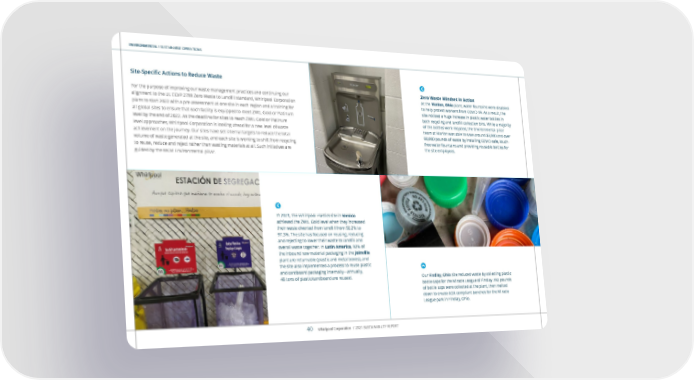 ENVIRONMENTAL / OUR ESG APPROACH ENVIRONMENTAL / SUSTAINABLE OPERATIONS Site-Specific Actions to Reduce Waste For the purpose of improving our waste management practices and continuing our alignment to the UL ECVP 2799 Zero Waste to Landfill standard, Whirlpool Corporation plans to start 2022 with a pre-assessment at one site in each region and a training for all global sites to ensure that each facility is equipped to meet ZWtL Gold or Platinum level by the end of 2022. As the deadline for sites to reach ZWtL Gold or Platinum level approaches, Whirlpool Corporation is looking ahead for a new level of waste achievement on the journey. Our sites have set internal targets to reduce the total volume of waste generated at the site, and each site is working to shift from recycling to reuse, reduce and reject rather than wasting materials at all. Such initiatives are guided by the WCM Environmental pillar. In 2021, the Whirlpool Plastics site in Mexico achieved the ZWtL Gold level when they increased their waste diverted from landfill from 92.2% to 97.3%. The site has focused on reusing, reducing and rejecting to lower their waste to landfill and overall waste together. In Latin America , 92% of the inbound raw material packaging in the Joinville plant are returnable (plastic and metal boxes), and the site also implemented a process to reuse plastic and cardboard packaging internally—annually, 48 tons of plastic/cardboard are reused. Our Findlay, Ohio site reduced waste by collecting plastic bottle caps for the Miracle League of Findlay. 192 pounds of bottle caps were collected at the plant, then melted down to create ADA compliant benches for the Miracle League park in Findlay, Ohio. Zero Waste Mindset In Action At the Marion, Ohio plant, water fountains were disabled to help protect workers from COVID-19. As a result, the site noticed a huge increase in plastic water bottles in both recycling and landfill collection bins. While a majority of the bottles were recycled, the Environmental pillar team at Marion was able to save around $3,000 and over 80,000 pounds of waste by installing COVID-safe, touch- free water fountains and providing reusable bottles for the site employees. Whirlpool Corporation / 2021 SUSTAINABILITY REPORT 40 Whirlpool Corporation / 2021 SUSTAINABILITY REPORT 40