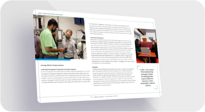 SOCIAL / WORKFORCE DEVELOPMENT & ENGAGEMENT Learning, Skills & Training Investment Leadership Development Programs & Internship Programs All around the globe, Whirlpool Corporation offers leadership development, internship and apprentice programs designed to provide high-potential early career talent with the opportunity to set a solid foundation for an accelerated career path. Within these programs, we set challenging goals and objectives for growth and high performance, as well as the opportunity for participants to create immediate impact in roles designed to make a difference. We also create a meaningful work environment, through a focus on collaboration, engagement and teamwork. Participants are provided with both functional and technical training to support their onboarding and acceleration in the program, as well as leadership development and soft skill curriculum. With dedicated executives as sponsors of the programs, robust roles and a strong alumni community, each program is designed to prepare individuals to become exceptional future leaders at Whirlpool Corporation. Leadership Development Development of leadership acumen within Whirlpool Corporation is also critical not only for ensuring people leaders are competent and confident in their ability to lead according to Whirlpool’s Leadership Model, but serves as an employee engagement lever. We recently launched several new leadership development programs for all levels of leaders. These programs include an Essentials of People Leadership program for new people leaders with eight interactive modules of content over a six-month period, all focused on developing foundational leadership behaviors. Through an executive development program, Immersion provides a three-day off-site immersive experience for executives to deep dive on Our Leadership Model. All programs are leader-led, with business leaders leading programs for new or early-career leaders and executive committee members leading programs for senior leaders. Leadership development is a crucial component of our overall HR strategy, and will continue to be an area of focus in the coming years. WeLEARN All global salaried employees have access to WeLEARN, our digital learning platform. WeLEARN provides a personalized learning experience that allows employees to access learning when and where they need it, collaborate with others who share similar interests through social learning groups, and build skills for today and tomorrow. It is a powerful platform that makes learning easy, meaningful, and social, so each employee can own their development. In 2021, the number of learning pathways with content tied to building specific skills and capabilities tripled, providing greater opportunities for learners to find meaningful, relevant content to fuel their professional and personal growth. In 2021, the number of formal learning pathways tripled, providing greater opportunities for learners to find meaningful, relevant content. Whirlpool Corporation / 2021 SUSTAINABILITY REPORT 53