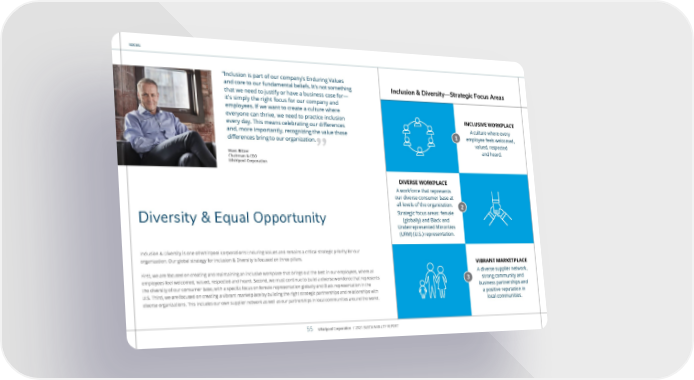 SOCIAL Diversity & Equal Opportunity Inclusion & Diversity is one of Whirlpool Corporation’s Enduring Values and remains a critical strategic priority for our organization. Our global strategy for Inclusion & Diversity is focused on three pillars. First, we are focused on creating and maintaining an inclusive workplace that brings out the best in our employees, where all employees feel welcomed, valued, respected and heard. Second, we must continue to build a diverse workforce that represents the diversity of our consumer base, with a specific focus on female representation globally and Black representation in the U.S. Third, we are focused on creating a vibrant marketplace by building the right strategic partnerships and relationships with diverse organizations. This includes our own supplier network as well as our partnerships in local communities around the world. Inclusion & Diversity—Strategic Focus Areas ” “Inclusion is part of our company’s Enduring Values and core to our fundamental beliefs. It’s not something that we need to justify or have a business case for— it’s simply the right focus for our company and employees. If we want to create a culture where everyone can thrive, we need to practice inclusion every day. This means celebrating our differences and, more importantly, recognizing the value those differences bring to our organization. Marc Bitzer Chairman & CEO Whirlpool Corporation INCLUSIVE WORKPLACE A culture where every employee feels welcomed, valued, respected and heard. DIVERSE WORKPLACE A workforce that represents our diverse consumer base at all levels of the organization. Strategic focus areas: female (globally) and Black and Underrepresented Minorities (URM) (U.S.) representation. VIBRANT MARKETPLACE A diverse supplier network, strong community and business partnerships and a positive reputation in local communities. 1 2 3 Whirlpool Corporation / 2021 SUSTAINABILITY REPORT 55