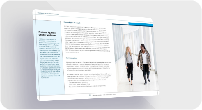 GOVERNANCE / GLOBAL ETHICS & COMPLIANCE Human Rights Approach Whirlpool Corporation supports the human rights of everyone we work with and expects our global business partners to do the same. We believe in global human rights, and our business practices reflect that commitment to ensure every person who works for us throughout all of our global operations does so of their own free will, in a safe and healthy environment. We oppose discrimination, slavery and child labor, and ensure we have controls and protections to avoid them. We support diversity and wage parity. We also respect the rights of our employees to associate with whom they choose and to be involved in politics outside of work. These values are also reflected in Our Integrity Manual. Moreover, Our Integrity Line can be used both internally and externally to bring concerns about human rights issues to our attention. In addition to our internal commitment to human rights, we also hold our suppliers and business partners accountable to comply with these same principles through our Supplier Code of Conduct. See our Responsible Sourcing section below for additional details of human and labor rights. Anti-Corruption We do business the right way. This means that we do not tolerate bribery or corruption of any kind. Moreover, it means that we are actively adhering to this principle in all aspects of our business. In addition to Our Integrity Manual, Whirlpool Corporation maintains a global anti-corruption policy, which provides guidance and details of our anti-corruption commitment and expectations. With leadership driven by our Executive Committee, the Global Ethics and Compliance Steering Committee, and Global Ethics and Compliance Team, and leveraging global and cross-functional resources, Whirlpool Corporation uses an anti-corruption program to identify and mitigate potential corruption risks. This includes: • Risk-based policies and procedures. • Online and in-person facilitated training. • Risk-based audits to monitor, mitigate, and eradicate corruption risks. Protocol Against Gender Violence In 2020, Whirlpool Argentina formalized a protocol against gender or female violence after new policy changes and the ratification of the ILO 190 Convention by Argentina. Whirlpool Corporation’s Diversity & Inclusion committee has been working on this initiative in collaboration with other companies, organizations and associations. We are currently in the process of refining the protocol with support from a local nonprofit. The main goal of the Protocol is to provide guidelines that ensure we provide a trusted and safe environment for our female employees so they can comfortably request paid time off and receive reliable support on legal issues as well as mental and health issues. Whirlpool Corporation / 2021 SUSTAINABILITY REPORT 86