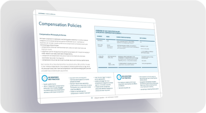 GOVERNANCE / OUR ESG APPROACH Compensation Policies Compensation Philosophy & Policies Whirlpool Corporation is dedicated to achieving global leadership in all of our product categories and to always delivering superior shareholder value. To achieve our objectives, we manage a pay-for-performance compensation philosophy based upon the following guiding principles: • Compensation should be incentive-driven with a focus on both short-term and long-term results. • A significant portion of pay should be performance-based, with the portion varying in direct relation to an executive’s level of responsibility. • Components of compensation should be linked to the drivers of sustainable shareholder value over the long-term. • Compensation should be tied to both business results and individual performance. Each member of our Executive Committee has elements of our ESG priorities included in their individual objectives for the purposes of individual performance ratings, which influence each executive’s incentive compensation. We reinforce emerging best practices and avoid those considered poor pay practices: ELEMENT FORM CHARACTERISTICS/PURPOSE 2021 METRICS Base Salary Cash Fixed component based on responsibility, experience and individual performance N/A Short-Term Incentives Annual Performance Cash Award Performance-based variable cash incentive to reward for achieving annual financial and individual performance goals Ongoing EBIT (50%) Free Cash Flow (50%) +/– 50% Modifier for Individual Performance Results Long-Term Incentives Performance Stock Units (70%) Stock Options (30%) Motivate and reward employees for the achievement of company financial and strategic performance over a preset three-year period beginning January 1, and promote retention Provide incentive for long-term stock price appreciation and promote retention Cumulative Ongoing Earnings Per Share (50%) ROIC (50%) Stock price appreciation OVERVIEW OF 2021 EXECUTIVE SALARY & INCENTIVE COMPENSATION ELEMENTS • Pay-for-performance • Use an independent compensation consultant that is solely engaged to provide executive compensation services to Whirlpool Corporation • Cap short-term and long-term incentive award payouts at market- competitive levels • Maintain robust stock ownership guidelines for our executives (7x salary multiple for CEO; 5x for other named executive officers) • Subject all variable pay to a compensation recovery “claw-back” • Have “double-trigger” change-in- control agreements • Carefully manage risk in our compensation programs to protect against unintended outcomes • Provide market-competitive perquisites deemed necessary to attract and retain top talent WE AVOID POOR PAY PRACTICES • No hedging or pledging of Whirlpool Corporation stock by executive officers or directors • No excise tax gross-ups WE REINFORCE BEST PRACTICES • No employment contracts except as required by local law or prevailing local market practice • No payment of dividends or dividend equivalents on grants of any Performance Stock Units (“PSUs”) or Restricted Stock Units (“RSUs”) prior to vesting • No repricing or reloading of stock options Whirlpool Corporation / 2021 SUSTAINABILITY REPORT 80