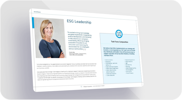 OUR APPROACH We believe that ESG is fundamental to our strategy and business, so we expanded our ESG Task Force to include key individuals and leaders from all functional areas to support execution of our key ESG initiatives, including members from: “I’m excited to bring my knowledge and global experiences in engineering, product development, and marketing to help advance our company’s sustainability efforts by bringing purposeful innovation to our consumers and improving the environment for our employees and our communities. Pamela Klyn Senior Vice President, Communications, Public Affairs and Sustainability ” • Communications • Compliance • Environmental, Health and Safety (EHS) • Global Information Systems • Global Product Organization • Global Product Quality, Safety & Regulatory • Government Relations • Human Resources • Integrated Supply Chain • Investor Relations • Legal • Manufacturing • Marketing • Global Strategic Sourcing • Risk Management • Sustainability • Tax and Treasury To further strengthen our ESG governance structure and integration into our business, we named Pam Klyn as Senior Vice President, Communications, Public Affairs and Sustainability as a member of the Executive Leadership team reporting to our Chairman and CEO. Klyn graduated from Michigan Technological University with a Bachelor’s Degree in Mechanical Engineering and earned a Master’s Degree in Mechanical Engineering from the University of Michigan, as well as a Master’s in Business Administration from Bowling Green State University. She is currently a Board member for the Boys & Girls Clubs of Benton Harbor and a Trustee for the Whirlpool Foundation. She serves on the Michigan Technological University External Advisory Board for the Dean of Engineering and on the Board of Directors for Patrick Industries. Task Force Composition ESG Leadership Whirlpool Corporation / 2021 SUSTAINABILITY REPORT 13