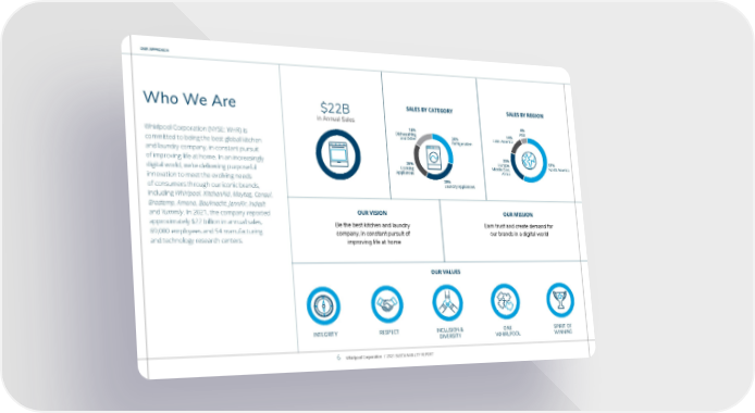 OUR APPROACH Whirlpool Corporation (NYSE: WHR) is committed to being the best global kitchen and laundry company, in constant pursuit of improving life at home. In an increasingly digital world, we’re delivering purposeful innovation to meet the evolving needs of consumers through our iconic brands, including Whirlpool , KitchenAid , Maytag , Consul , Brastemp , Amana , Bauknecht , JennAir , Indesit and Yummly . In 2021, the company reported approximately $22 billion in annual sales, 69,000 employees and 54 manufacturing and technology research centers. Who We Are $22B in Annual Sales 30% Refrigeration 28% Laundry Appliances 26% Cooking Appliances 16% Dishwashing and Other SALES BY CATEGORY 57% North America 23% Europe, Middle East, Africa 14% Latin America 6% Asia SALES BY REGION Be the best kitchen and laundry company, in constant pursuit of improving life at home OUR VISION Earn trust and create demand for our brands in a digital world OUR MISSION OUR VALUES INCLUSION & DIVERSITY INTEGRITY ONE WHIRLPOOL SPIRIT OF WINNING RESPECT 30% Refrigeration 28% Laundry Appliances 26% Cooking Appliances 16% Dishwashing and Other Whirlpool Corporation / 2021 SUSTAINABILITY REPORT 6