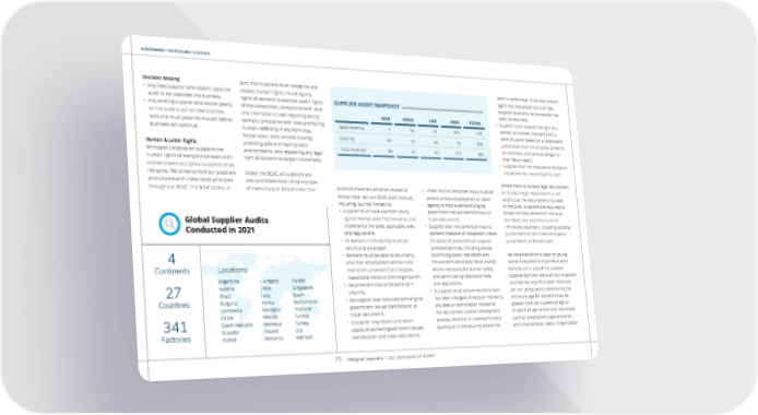 GOVERNANCE / RESPONSIBLE SOURCING Decision Making • Any new supplier who doesn’t pass the audit is not awarded the business. • Any existing supplier who scores poorly on the audit is put on new business hold and must pass the re-audit before business can continue. Human & Labor Rights Whirlpool Corporation supports the human rights of everyone we work with, and we expect our global suppliers to do the same. We strive to hold our suppliers accountable with these same principles through our SCoC. The SCoC states, in auditors check for activities related to forced labor per our SCoC audit manual, including, but not limited to: • Supplier must have a written policy against forced labor that complies and implements the code, applicable laws and regulations. • All workers in the facility must be voluntarily employed. • Workers must be able to voluntarily end their employment without any restriction, provided that they give reasonable notice to their organization. • No prisoners should be working in a facility. • No supplier may hold a worker’s original government-issued identification or travel documents. • A supplier may obtain and retain copies of workers’ government-issued identification and travel documents. NAR EMEA LAR ASIA TOTAL New/Potential 1 16 21 101 139 Existing 45 35 46 76 202 Total Audited 46 51 67 177 341 SUPPLIER AUDIT SNAPSHOT part, that suppliers must recognize and respect human rights, including any rights of workers to exercise lawful rights of free association, compliance with local and international laws regarding young workers, compliance with laws prohibiting human trafficking in any form (e.g., forced labor, debt bonded slavery), providing safe and healthy work environments, and respecting any legal right of workers to bargain collectively. Under the SCoC, all suppliers are also prohibited from using any type of involuntary or forced labor. Our • Under no circumstances may a supplier allow a private employment or labor agency to hold a worker’s original government-issued identification or travel documents. • Supplier shall not confine or restrict workers’ freedom of movement inside the place of production or supplier- provided facilities, including access to drinking water, restrooms and the worker’s dormitory room, except where necessary for worker safety and permitted by applicable laws and regulations. • A supplier must ensure workers have not been charged, directly or indirectly, any fees or commission related to the recruitment and/or employment process, whether in a worker’s home country or in the country where the work is performed. If the recruitment agent has requested any such fee, supplier must ensure the worker has been reimbursed. • Supplier must respect the right of a worker to remove themself from a work situation based on a reasonable justification that the situation presents an imminent and serious danger to their life or health. • Supplier shall not retaliate or discipline any worker for exercising this right. Where there is no local legal requirement or if a local legal requirement is not as strict as the requirement included in the SCoC, suppliers are required to follow the requirements in the SCoC. Our SCoC also prohibits harsh or inhumane treatment, including corporal punishment or the threat of corporal punishment, or forced labor. No instances of child labor or young workers exposed to hazardous work were found in any of the audited supplier facilities. We audit our suppliers to check for any child labor instances per our policy, which determines the minimum age for workers must be greater than: (a) 15 years of age or 14 years of age where local law allows such an employment age consistent with International Labour Organization 4 Continents 27 Countries 341 Factories Argentina Austria Brazil Bulgaria Cambodia China Czech Republic Ecuador France Hungary India Italy Korea Malaysia Mexico Morocco Poland Romania Russia Singapore Spain Switzerland Thailand Tunisia Turkey U.S. Vietnam Global Supplier Audits Conducted in 2021 Locations Whirlpool Corporation / 2021 SUSTAINABILITY REPORT 79