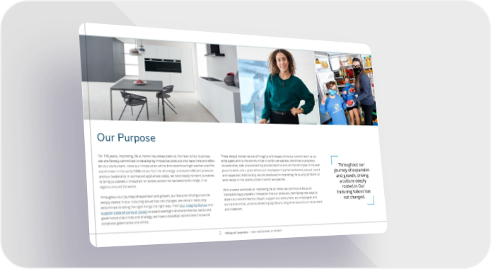 For 110 years, improving life at home has always been at the heart of our business. We are fiercely committed to developing innovative products that save time and effort for our consumers. From our introduction of the first electric wringer washer and first stand mixer in the early 1900s to our full line of energy- and water-efficient products and our leadership in connected appliances today, we relentlessly reinvent ourselves to bring purposeful innovation to homes across the socioeconomic range, in all regions around the world. Throughout our journey of expansion and growth, our focus on driving a culture deeply rooted in Our Enduring Values has not changed. We remain resolutely determined to doing the right things the right way. From Our Integrity Manual and Supplier Code of Conduct (SCoC) to board oversight of environmental, social and governance (ESG) risks and strategy, we have a steadfast commitment to sound corporate governance and ethics. Our Purpose These deeply rooted values of integrity and respect drive our commitment to our employees and to the communities in which we operate. We strive to provide a collaborative, safe and welcoming environment to ensure that Whirlpool is the best place to work and a place where our employees truly feel welcomed, valued, heard and respected. Additionally, we are dedicated to improving the quality of life for all who reside in the communities in which we operate. With a vision anchored on improving life at home, we continue to focus on incorporating purposeful innovation into our products, identifying new ways to lessen our environmental impact, support our consumers, our employees and our communities, all while delivering significant, long-term value to our consumers and investors. Throughout our journey of expansion and growth, driving a culture deeply rooted in Our Enduring Values has not changed. Whirlpool Corporation / 2021 SUSTAINABILITY REPORT 2